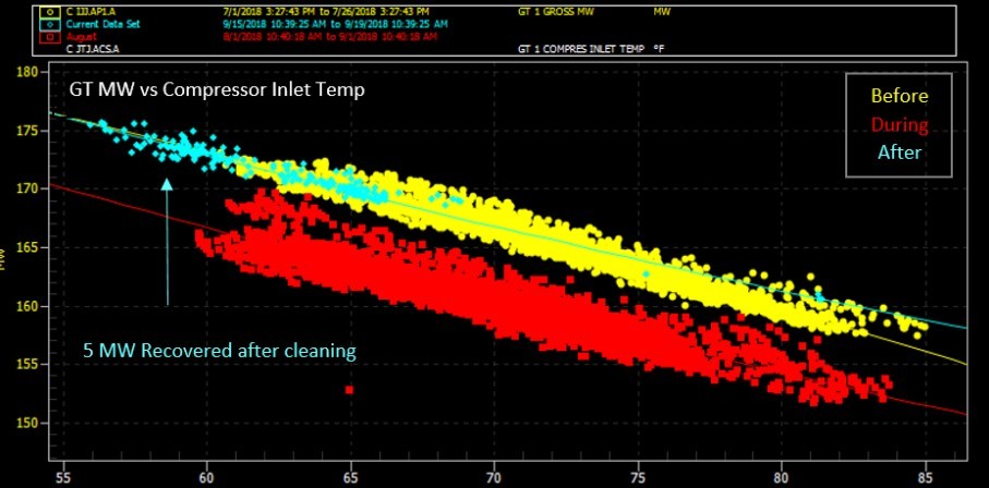Since the drop in compressor efficiency occurred on two separate machines around the same time, the issue was believed to be related to the intake. It was determined that wildfires in the area caused compressor fouling due to particulates in the air.